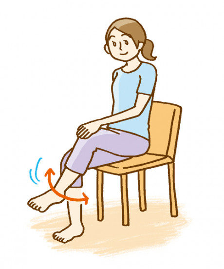 椅子に浅く腰かけて、片足を少し浮かせ、足首を大きくゆっくりと10回まわします。