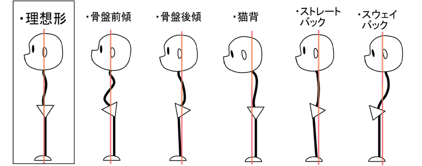 不良姿勢には骨盤前傾姿勢、骨盤後傾姿勢、猫背姿勢、ストレートバック姿勢、スウェイバック姿勢などいろいろありますが