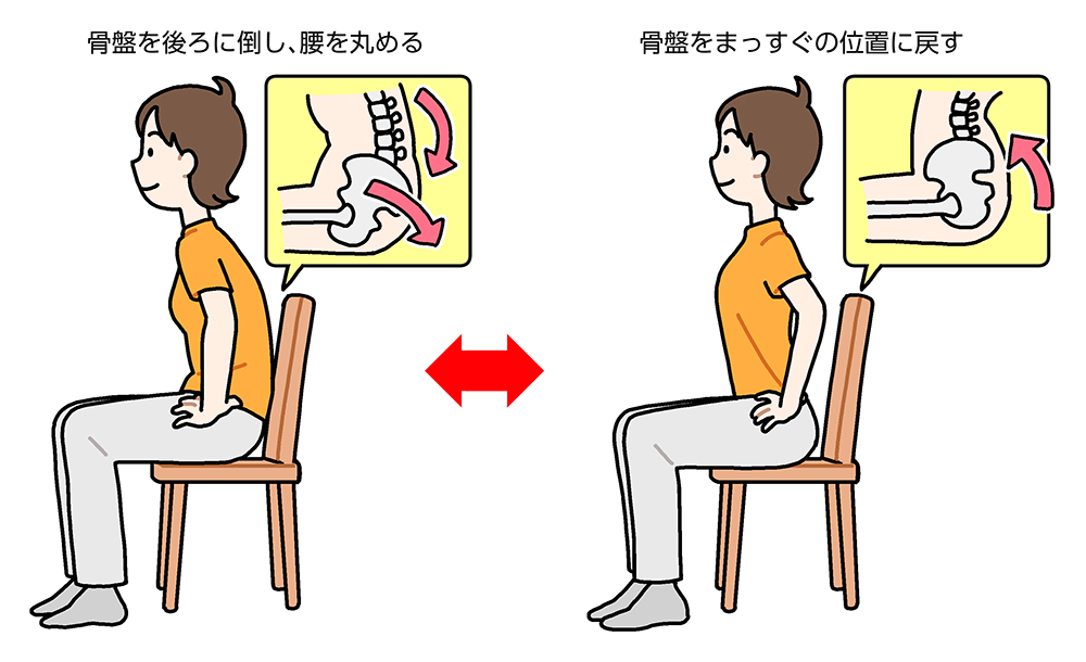 座った状態でも立った状態でもやってみて、自分の骨盤の位置を確認してみましょう。