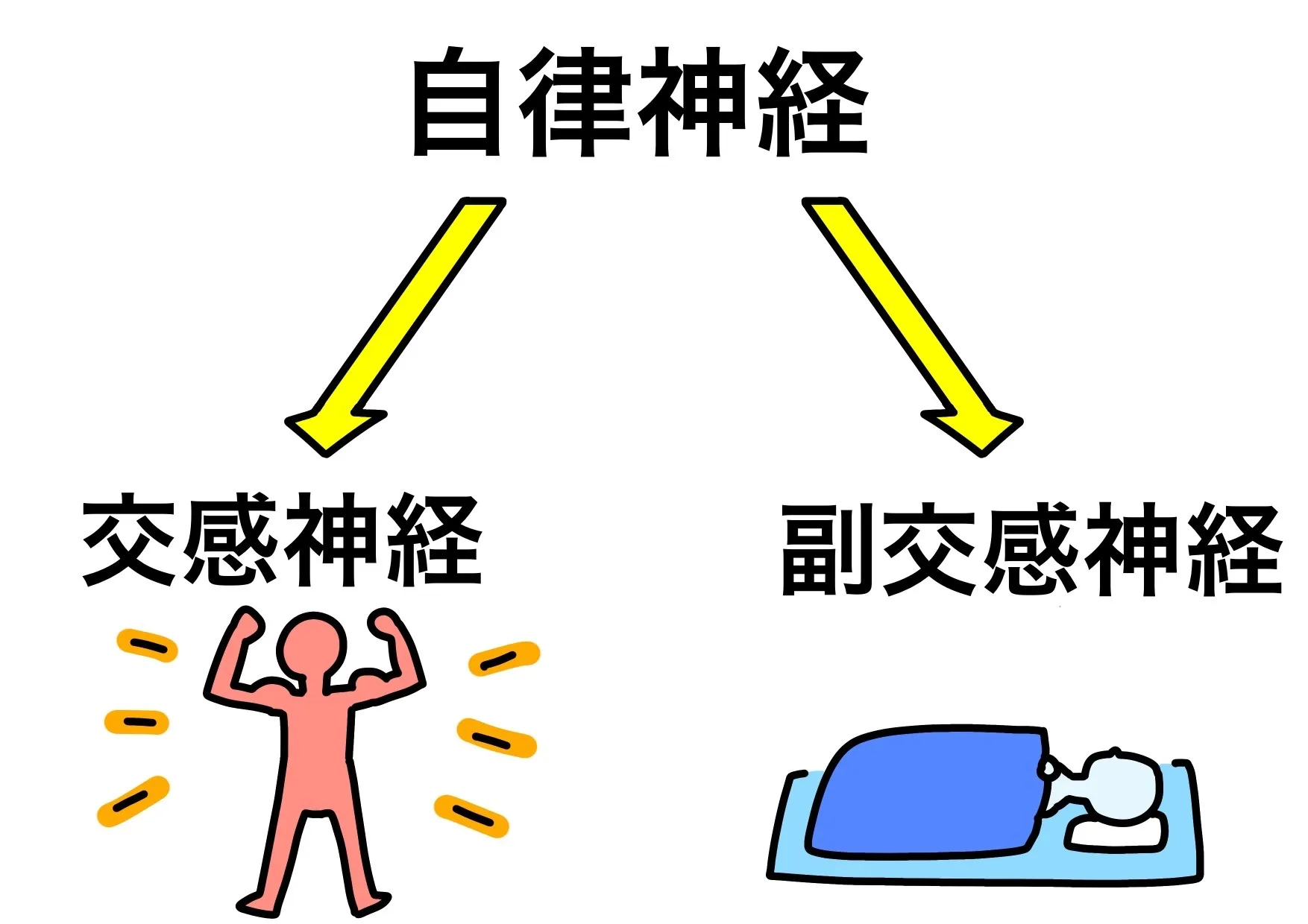 - 副交感神経:リラックスモードのブレーキ夜寝ているときや、リラックスしているとき、食事中などに優位になる神経。血管を拡張させて心拍数を下げ、心身を休息・回復モードにする
